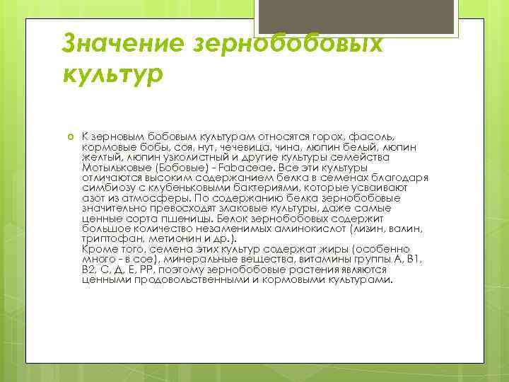 Значение зернобобовых культур К зерновым бобовым культурам относятся горох, фасоль, кормовые бобы, соя, нут, чечевица, чина, люпин белый, люпин желтый, люпин узколистный и другие культуры семейства Мотыльковые (Бобовые) - Fabaceae. Все эти культуры отличаются высоким содержанием белка в семенах благодаря симбиозу с клубеньковыми бактериями, которые усваивают азот из атмосферы. По содержанию белка зернобобовые значительно превосходят злаковые культуры, даже самые ценные сорта пшеницы. Белок зернобобовых содержит большое количество незаменимых аминокислот (лизин, валин, триптофан, метионин и др. ). Кроме того, семена этих культур содержат жиры (особенно много - в сое), минеральные вещества, витамины группы А, В 1, В 2, С, Д, Е, РР, поэтому зернобобовые растения являются ценными продовольственными и кормовыми культурами.