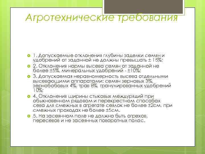 Агротехнические требования 1. Допускаемые отклонения глубины заделки семян и удобрений от заданной не должны превышать ± 15%; 2. Отклонения нормы высева семян от заданной не более ± 5%, минеральных удобрений - ± 10%; 3. Допускаемая неравномерность высева отдельными высевающими аппаратами: семян зерновых 3%, зернобобовых 4%, трав 8%, гранулированных удобрений 10%; 4. Отклонения ширины стыковых междурядий при обыкновенном рядовом и перекрестном способах сева для смежных в агрегате сеялок не более ± 2 см, при смежных проходах не более ± 5 см. 5. На засеянном поле не должно быть огрехов, пересевов и не засеянных поворотных полос.