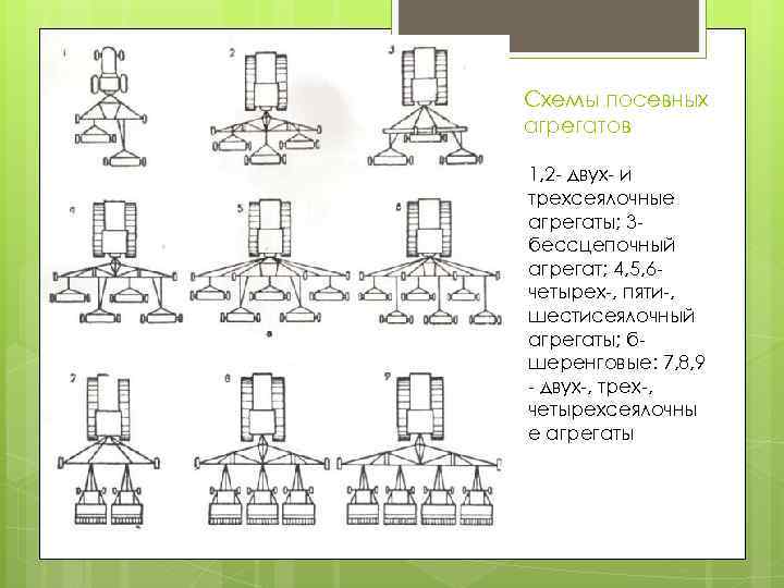 Схемы посевных агрегатов 1, 2 - двух- и трехсеялочные агрегаты; 3 бессцепочный агрегат; 4, 5, 6 четырех-, пяти-, шестисеялочный агрегаты; бшеренговые: 7, 8, 9 - двух-, трех-, четырехсеялочны е агрегаты