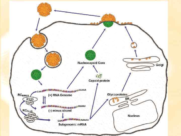 Seondumine rakule ja sisenemine rakku Alphaviiruste infektsioonitsükkel on suhteliselt kiire (ca 6 tundi imetajate ja 1520 tundi putukate rakkudes) ja neile on iseloomulik lai peremeestering. See on võimalik, kuna rakkudesse sisenemiseks kasutatakse alternatiivseid retseptoreid. Näidatud on, et SIN retseptoriteks on 67 k. Da laminin-retseptor, hepariin-sulfaat, 63 k. Da valk (linnu rakud), 74 ja 110 k. Da valgud (neuronid). Mingid retseptorid peavad olema ka lülijalgsete vektorite rakkudel. 2011 aastal näidati et nii putuka- kui imatajarakkudes kasutab SIN retseptoriks natural resistance-associated macrophage protein (NRAMP) valku. Alphaviiruse antiretseptoriks on E 2 glükoproteiin. Retseptor-antiretseptor interaktsioon indutseerib virionis konformatsioonilised muutused, mis on olulised partikli edasisel lahtipakkimisel. Rakku sisenemine toimub retseptor-vahendatud endotsütoosi teel, viiruse membraani liitumine vesikulide membraaniga on p. H-ist sõltuv protsess: happelistes tingimustes (p. H 5 -6) E 1: E 2 dimeerid dissotsieeruvad ja moodustuvad E 1 trimeerid, mis on aktiivseks fusion-valguks. Membraanide liitumise tulemusena vabaneb viiruse kapsiid tsütoplasmasse. Tsütoplasmas toimub nukleokapsiidi lahtiharutamine raku ribosoomide poolt. Selle tulemusena vabaneb viiruse genoomne RNA raku tsütoplasmasse. Nakatanud rakud on superinfektsiooni suhtes resistentsed (alates 0. 5 -1 tundi peale primaarset infektsiooni).