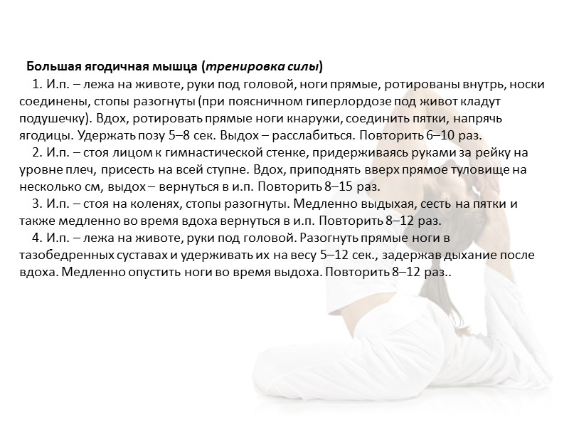 Большая ягодичная мышца (тренировка силы) 1. И.п. – лежа на животе, руки под головой, ноги прямые, ротированы внутрь, носки соединены, стопы разогнуты (при поясничном гиперлордозе под живот кладут подушечку). Вдох, ротировать прямые ноги кнаружи, соединить пятки, напрячь ягодицы. Удержать позу 5–8 сек. Выдох – расслабиться. Повторить 6–10 раз. 2. И.п. – стоя лицом к гимнастической стенке, придерживаясь руками за рейку на уровне плеч, присесть на всей ступне. Вдох, приподнять вверх прямое туловище на несколько см, выдох – вернуться в и.п. Повторить 8–15 раз. 3. И.п. – стоя на коленях, стопы разогнуты. Медленно выдыхая, сесть на пятки и также медленно во время вдоха вернуться в и.п. Повторить 8–12 раз. 4. И.п. – лежа на животе, руки под головой. Разогнуть прямые ноги в тазобедренных суставах и удерживать их на весу 5–12 сек., задержав дыхание после вдоха. Медленно опустить ноги во время выдоха. Повторить 8–12 раз..