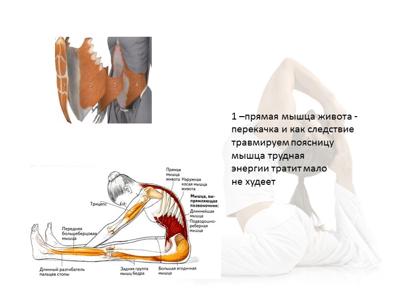 1 –прямая мышца живота -перекачка и как следствие травмируем поясницу мышца трудная энергии тратит мало не худеет