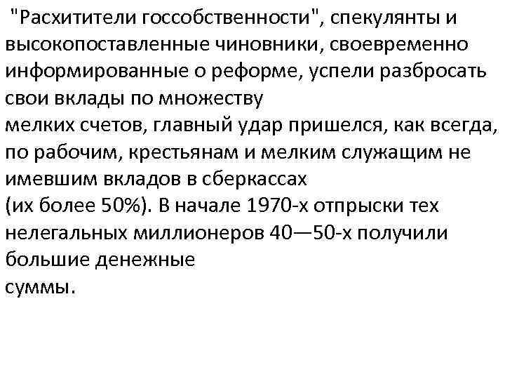 "Расхитители госсобственности", спекулянты и высокопоставленные чиновники, своевременно информированные о реформе, успели разбросать свои вклады по множеству мелких счетов, главный удар пришелся, как всегда, по рабочим, крестьянам и мелким служащим не имевшим вкладов в сберкассах (их более 50%). В начале 1970 -х отпрыски тех нелегальных миллионеров 40— 50 -х получили большие денежные суммы.