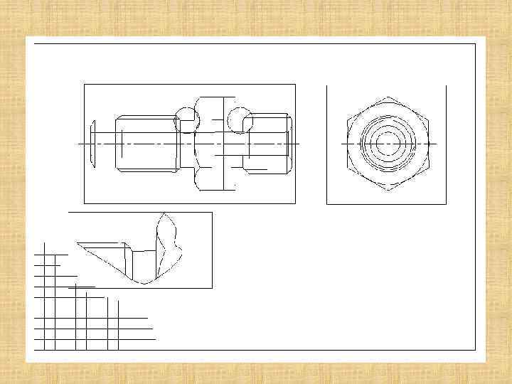 2 -ой этап- выполнение изображений: • на листе вычерчивают рамку и прямоугольники для основной и дополнительной надписей, наносят тонкими линиями габаритные прямоугольники изображений, соблюдая проекционную связь и предусматривая между ними места для размещения размерных линий; • внутри габаритных прямоугольников проводят оси симметрии (если деталь симметрична); • строят изображения в тонких линиях, начиная с основной геометрической формы из числа составляющих деталь; • выполняют разрезы и сечения, выносные элементы, наносят условное обозначение резьбы; • проверяют построения и при необходимости вносят исправления, удаляют вспомогательные линии, обводят линии контура, штрихуют разрезы и сечения.