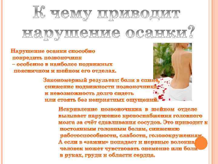 • режим дня, к примеру, если мало • разная длина ног, из-за этого отводить времени на сон, то возникает перекос позвоночника ухудшится не только осанка • различные заболевания: рахит, • гиподинамия, то есть, недостаточное туберкулёз, радикулит количество движений. Мышцы не • дефекты зрения и слуха, чтобы получают нагрузку и становятся лучше видеть и слышать человек принимает неправильное положение дряблыми и слабыми осанки