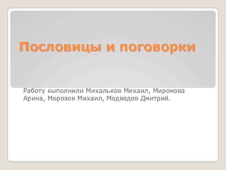 Пословицы и поговорки Работу выполнили Михальков Михаил, Миронова Арина, Морозов Михаил, Медведев Дмитрий.
