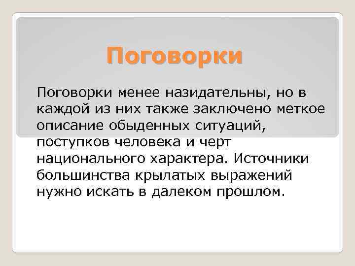 Поговорки менее назидательны, но в каждой из них также заключено меткое описание обыденных ситуаций, поступков человека и черт национального характера. Источники большинства крылатых выражений нужно искать в далеком прошлом.