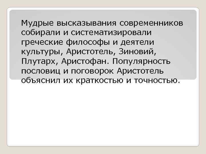 Мудрые высказывания современников собирали и систематизировали греческие философы и деятели культуры, Аристотель, Зиновий, Плутарх, Аристофан. Популярность пословиц и поговорок Аристотель объяснил их краткостью и точностью.