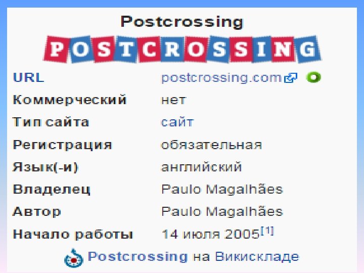 Интересные факты • Первая открытка проекта отправлена из Португалии в Португалию и имела • id PT-1 • 14 октября 2011 года компанией Post. NL, осуществляющей почтовые услуги на территории Нидерландов, был выпущен блок марок, посвященный посткроссингу. • Открытка с кодом RU-1000000 (российская «миллионная» открытка) вышла 24 мая 2012 года и дошла из города Уфы в город Тольятти