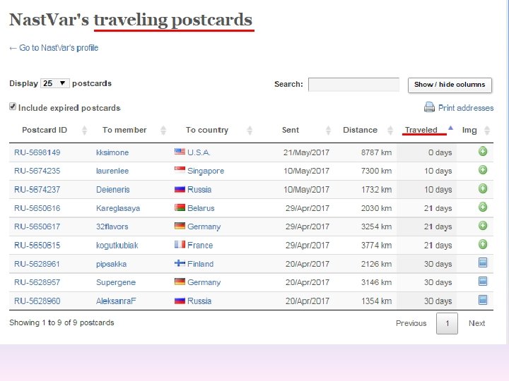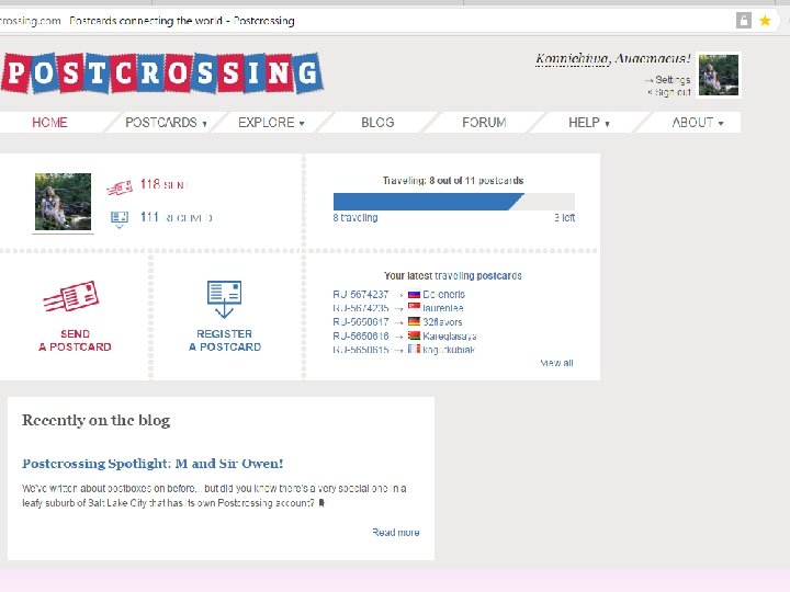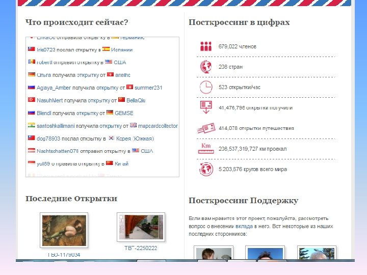 Postcrossing • проект, созданный для • возможности получения открыток со всего мира; возник под влиянием буккроссинга. В основе принципа обмена открытками лежит единая база всех участников проекта, а также механизм выдачи адресов, направленный на то, чтобы разница между отправленными и полученными открытками у каждого участника была минимальной. При этом в посткроссинге имеет место система непрямого обмена, то есть отправляя открытки одним пользователям, участник получает их от других. A project created for the possibility of receiving postcards from around the world; Appeared under the influence of bookcrossing. At the heart of the principle of exchanging postcards is the uniform base of all project participants, as well as the address issuance mechanism, aimed at ensuring that the difference between sent and received postcards from each participant is minimal. In this postcrossing, there is a system of indirect exchange, that is, sending postcards to one user, the participant receives them from others.