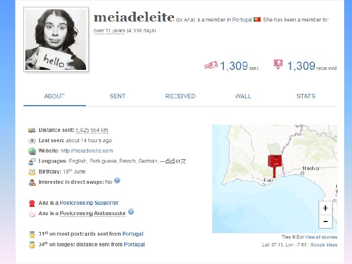• Ана Кампос (Португалия) • Ana помогает членам со всего мира использовать Postcrossing, а также является редактором и куратором блога проекта. • Она пристрастилась к симпатичным канцелярским принадлежностям и является шеф-поваром в штаб-квартире кухни.