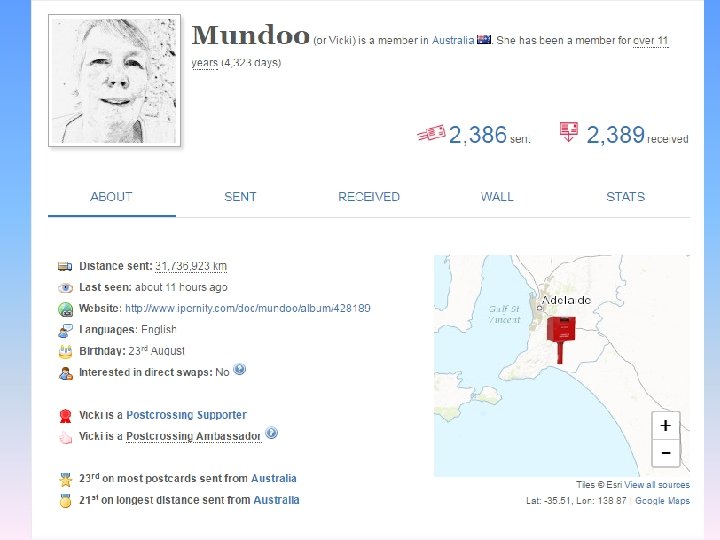 • Вики Кроуфорд (Австралия) • Она является администратором форума и надежным консультантом по всем вопросам. Вики также заботится о многих задачах, которые позволяют Postcrossing работать плавно. • Она занимается геокешингом и любит фотографировать восходы на острове Хиндмарш.