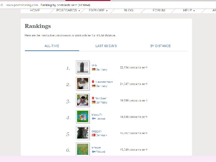Statistics • The postcross site contains a variety of statistics for each user, and for each country, and for the whole project as a whole. According to this statistics, on August 18, 2014, people from all countries of the earth took part in postcrossing, with the exception of most of West Africa, Gabon, and a number of island countries in Oceania that do not have a single postcard sent.