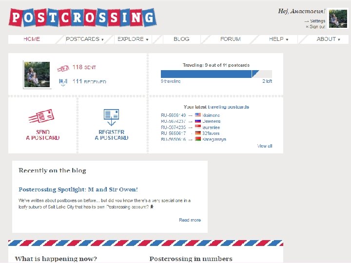 Interesting Facts • The first postcard of the project was sent from Portugal to Portugal and had • Id PT-1 • On October 14, 2011 Post. NL, which provides postal services in the Netherlands, issued a block of stamps dedicated to postcrossing. • A postcard with the code RU-1000000 (Russian "million" postcard) was published on May 24, 2012 and came from the city of Ufa to the city of Togliatti