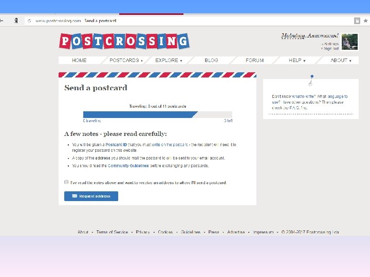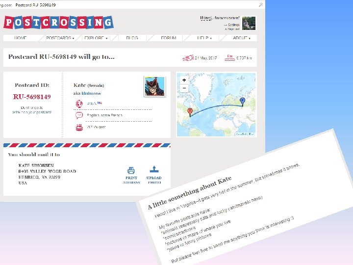 Как это работает? • Во-первых, короткая версия: • • • Запросить адрес с веб-сайта Отправить открытку по адресу Ждать, чтобы получить открытку Зарегистрировать полученную открытку в системе Первым шагом является просьба отправить открытку. На веб-сайте отобразится (и отправлено вам электронное письмо) с адресом другого участника и идентификатором открытки (например, US-786). Затем вы отправляете открытку этому участнику. • Участник получает открытку и регистрирует ее, используя идентификатор открытки, который находится на открытке. В этот момент вы можете получить открытку от другого пользователя. Вы находитесь в очереди за следующим лицом, которое просит отправить открытку. Где открытка приходит с сюрпризом! • Вы можете иметь до 5 открыток, путешествующих в любое время. Каждый раз, когда одна из открываемых вами почтовых карточек регистрируется, вы можете запросить другой адрес. Количество открыток, которым разрешено путешествовать в любое время, увеличивается, чем больше отправляемых вами открыток! Предложить исправление •