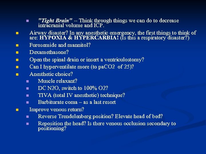 "Tight Brain" -- Think through things we can do to decrease intracranial volume and ICP. Airway disaster? In any anesthetic emergency, the first things to think of are: HYPOXIA & HYPERCARBIA! (Is this a respiratory disaster? ) Furosemide and mannitol? Dexamethasone? Open the spinal drain or insert a ventriculostomy? Can I hyperventilate more (to pa. CO 2 of 25)? Anesthetic choice? Muscle relaxant? DC N 2 O, switch to 100% O 2? TIVA (total IV anesthetic) technique? Barbiturate coma – as a last resort Improve venous return? Reverse Trendelenberg position? Elevate head of bed? Reposition the head? Is there venous occlusion secondary to positioning?