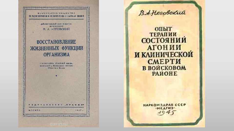 Владимир Александрович Неговский (1909 — 2003) крупнейший патофизиолог, создатель реаниматологии, родоначальник школы отечественных реаниматологов, создатель первого в мире Научноисследовательского института общей реаниматологии (НИИОР РАМН), первооткрыватель новой нозологической единицы (постреанимационной болезни), доктор медицинских наук (1943), профессор (1947), академик АМН СССР (1975).