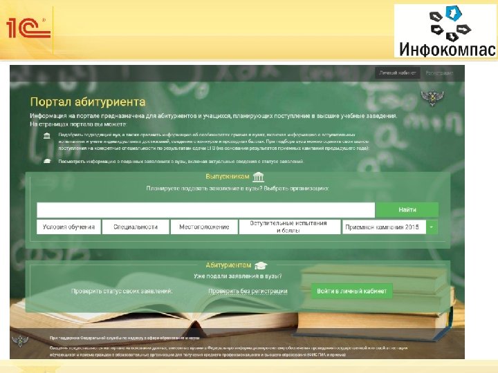 Управление приемной кампанией. § хранение и обработка информации об абитуриентах § ведение картотеки личных дел абитуриентов § формирование пакета документов абитуриентов и приемной комиссии § подготовка выходных печатных документов (рейтинги, приказы, выписки) § информирование поступающих о ходи приемной кампании § возможность интеграции с «личным кабинетом поступающего» § возможность интеграции с сайтом вуза § Мастер списков поступающих