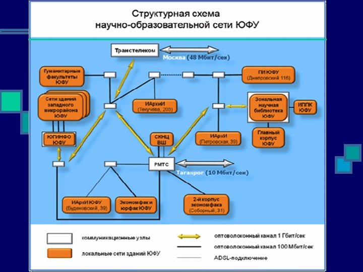 Создание магистральной инфраструктуры ТС ЮФУ-Ростов на базе ТС ЮФУ-центр n n n Подключение оптоволоконными каналами 2 зданий ПИ ЮФУ и 1 здания ИАрх. И ЮФУ Подключение ADSL-каналами 2 зданий ИАрх. И Расширение внешнего канала ЮФУ до 32 Мбит/сек Увеличение до 10 Мбит/сек емкости канала к ТТИ ЮФУ (+ «наноканал» 10 Мбит/сек) Развитие технологий и сетевых служб сети ЮФУ -центр