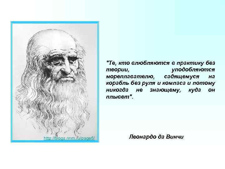 "Те, кто влюбляются в практику без теории, уподобляются мореплавателю, садящемуся на корабль без руля и компаса и потому никогда не знающему, куда он плывет". http: //blogs. nnm. ru/page 6/ Леонардо да Винчи