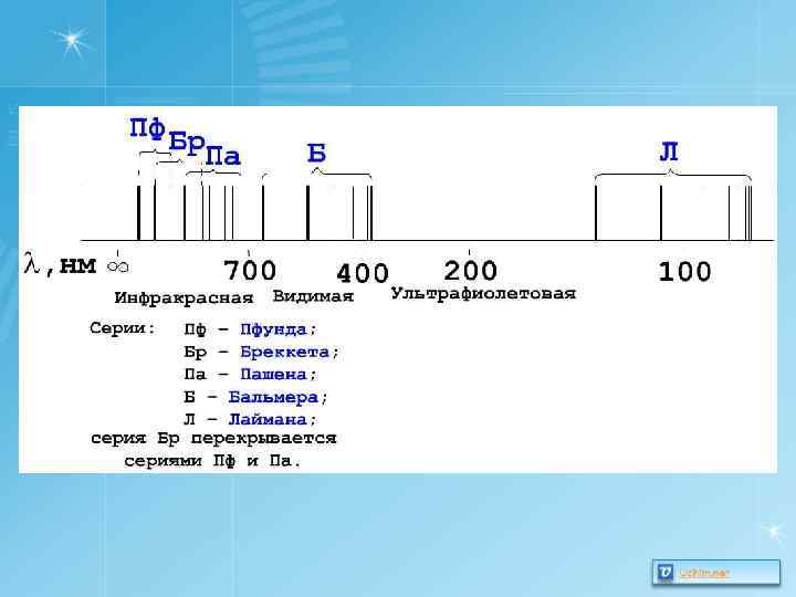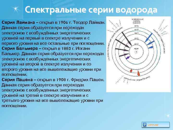 Спектральные серии водорода Серия Лаймана – открыл в 1906 г. Теодор Лайман. Данная серия образуется при переходах электронов с возбуждённых энергетических уровней на первый в спектре излучения и с первого уровня на все остальные при поглощении. Серия Бальмера – открыл в 1885 г. Иоганн Бальмер. Данная серия образуется при переходах электронов с возбужденных энергетических уровней на второй в спектре излучения и со второго уровня на все вышележащие уровни при поглощении. Серия Пашена – открыл в 1908 г. Фридрих Пашен. Данная серия образуется при переходах электронов с возбужденных энергетических уровней на третий в спектре излучения и с третьего уровня на все вышележащие уровни при поглощении.