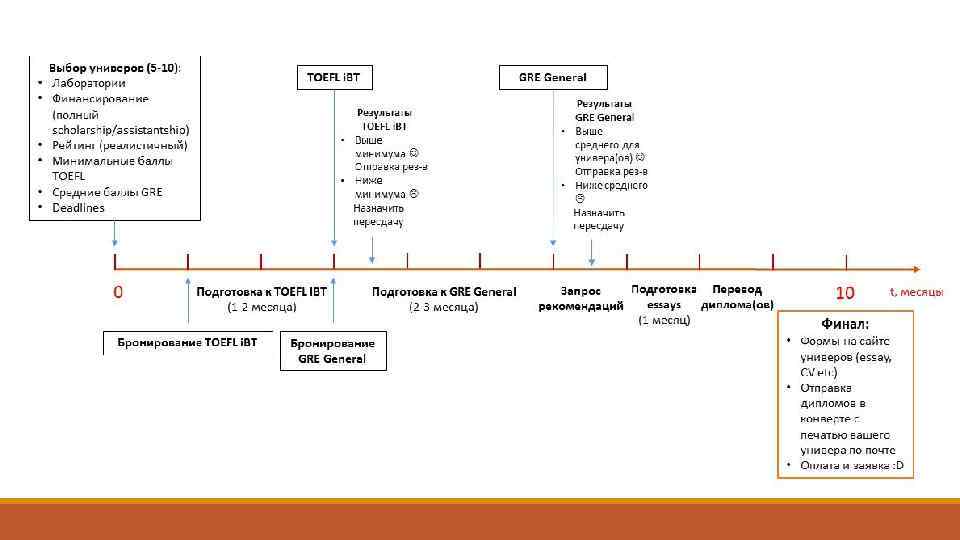 Последовательность действий: Если начинать за год • Выберете 5 -10 университетов для поступления (лучше 10) • Подготовьтесь и сдайте TOEFL • Подготовьтесь и сдайте GRE General • (возможно) Сдайте GRE Subject • Напишите письма профессорам, в лабораториях которых Вы хотите работать • Подготовьте personal statement • Подготовьте копии диплома(ов) со всмеми предметами и оценками на англ языке. Лучше заверить копии в учебной части.