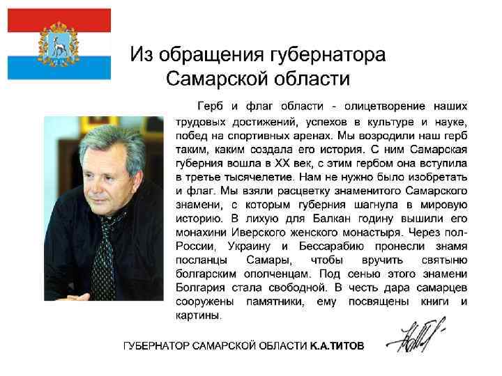 Флаг Самарской области утвержден 30 декабря 1998 года. Флаг Самарской области представляет собой прямоугольное полотнище из трех равновеликих горизонтальных полос: верхней - красного, средней - белого и нижней - голубого цвета. В середине Флага изображен герб Самарской области размером, равным по высоте двум третям ширины флага. Соотношение ширины и длины флага составляет 1: 2 Историческая справка о флаге