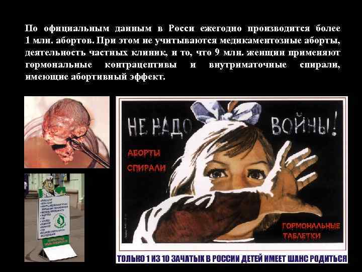 По официальным данным в Росси ежегодно производится более 1 млн. абортов. При этом не учитываются медикаментозные аборты, деятельность частных клиник, и то, что 9 млн. женщин применяют гормональные контрацептивы и внутриматочные спирали, имеющие абортивный эффект.