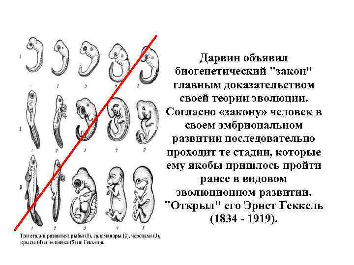 Дарвин объявил биогенетический "закон" главным доказательством своей теории эволюции. Согласно «закону» человек в своем эмбриональном развитии последовательно проходит те стадии, которые ему якобы пришлось пройти ранее в видовом эволюционном развитии. "Открыл" его Эрнст Геккель (1834 - 1919).