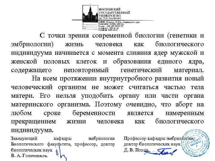 С точки зрения современной биологии (генетики и эмбриологии) жизнь человека как биологического индивидуума начинается с момента слияния ядер мужской и женской половых клеток и образования единого ядра, содержащего неповторимый генетический материал. На всем протяжении внутриутробного развития новый человеческий организм не может считаться частью тела матери. Его нельзя уподобить органу или части органа материнского организма. Поэтому очевидно, что аборт на любом сроке беременности является намеренным прекращением жизни человека как биологического индивидуума. Заведующий кафедры эмбриологии Биологического факультета, профессор, доктор биологических наук В. А. Голиченков. Профессор кафедры эмбриологии, доктор биологических наук Д. В. Попов.