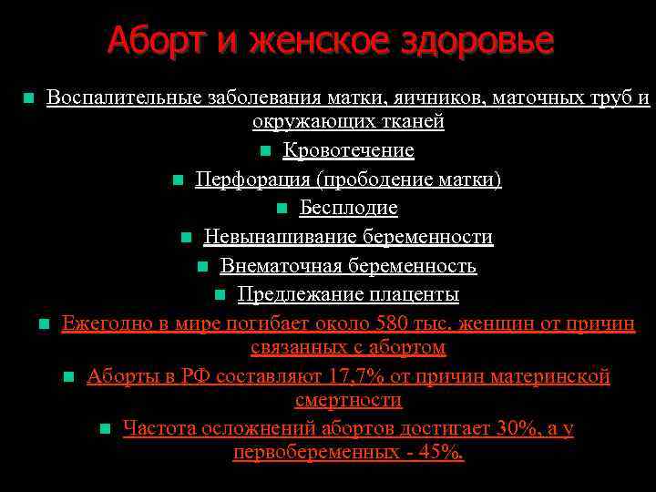 Аборт и женское здоровье n Воспалительные заболевания матки, яичников, маточных труб и окружающих тканей n Кровотечение n Перфорация (прободение матки) n Бесплодие n Невынашивание беременности n Внематочная беременность n Предлежание плаценты n Ежегодно в мире погибает около 580 тыс. женщин от причин связанных с абортом n Аборты в РФ составляют 17, 7% от причин материнской смертности n Частота осложнений абортов достигает 30%, а у первобеременных - 45%.