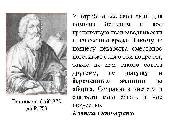 Гиппократ (460 -370 до Р. Х. ) Употреблю все свои силы для помощи больным и воспрепятствую несправедливости и нанесению вреда. Никому не поднесу лекарства смертоносного, даже если о том попросят, также не дам такого совета другому, не допущу и беременных женщин до аборта. Сохраню в чистоте и святости мою жизнь и мое искусство. Клятва Гиппократа.
