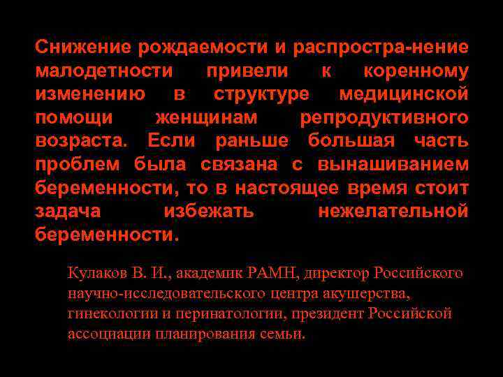 Снижение рождаемости и распростра-нение малодетности привели к коренному изменению в структуре медицинской помощи женщинам репродуктивного возраста. Если раньше большая часть проблем была связана с вынашиванием беременности, то в настоящее время стоит задача избежать нежелательной беременности. Кулаков В. И. , академик РАМН, директор Российского научно-исследовательского центра акушерства, гинекологии и перинатологии, президент Российской ассоциации планирования семьи.
