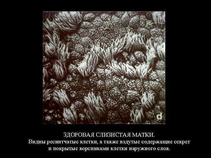 ЗДОРОВАЯ СЛИЗИСТАЯ МАТКИ. Видны реснитчатые клетки, а также вздутые содержащие секрет и покрытые ворсинками клетки наружного слоя.