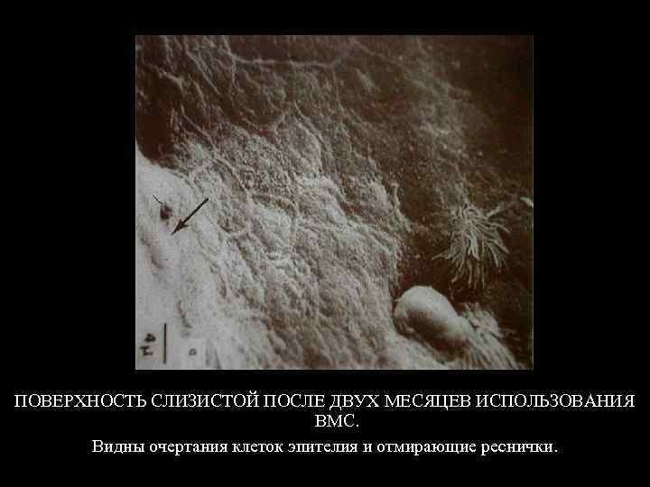 ПОВЕРХНОСТЬ СЛИЗИСТОЙ ПОСЛЕ ДВУХ МЕСЯЦЕВ ИСПОЛЬЗОВАНИЯ ВМС. Видны очертания клеток эпителия и отмирающие реснички.