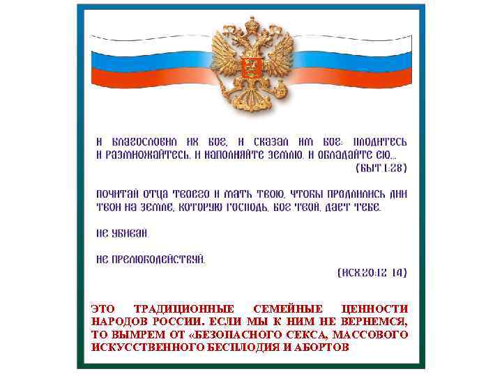 ЭТО ТРАДИЦИОННЫЕ СЕМЕЙНЫЕ ЦЕННОСТИ НАРОДОВ РОССИИ. ЕСЛИ МЫ К НИМ НЕ ВЕРНЕМСЯ, ТО ВЫМРЕМ ОТ «БЕЗОПАСНОГО СЕКСА, МАССОВОГО ИСКУССТВЕННОГО БЕСПЛОДИЯ И АБОРТОВ