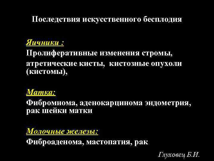 Последствия искусственного бесплодия • Яичники : • Пролиферативные изменения стромы, • атретические кисты, кистозные опухоли (кистомы), • Матка: • Фибромиома, аденокарцинома эндометрия, рак шейки матки • Молочные железы: • Фиброаденома, мастопатия, рак Глуховец Б. И.