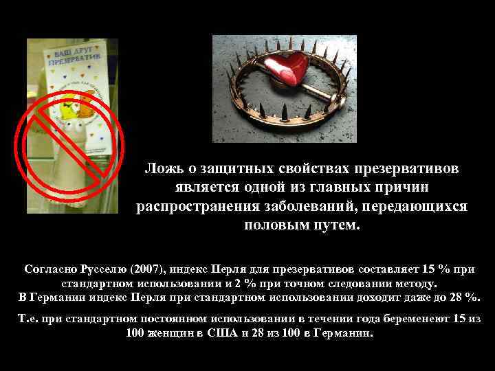 Ложь о защитных свойствах презервативов является одной из главных причин распространения заболеваний, передающихся половым путем. Согласно Русселю (2007), индекс Перля для презервативов составляет 15 % при стандартном использовании и 2 % при точном следовании методу. В Германии индекс Перля при стандартном использовании доходит даже до 28 %. Т. е. при стандартном постоянном использовании в течении года беременеют 15 из 100 женщин в США и 28 из 100 в Германии.