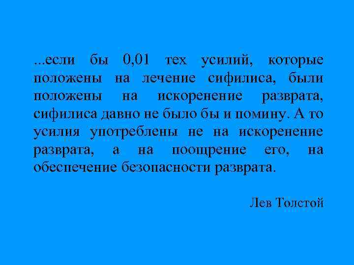 . . . если бы 0, 01 тех усилий, которые положены на лечение сифилиса, были положены на искоренение разврата, сифилиса давно не было бы и помину. А то усилия употреблены не на искоренение разврата, а на поощрение его, на обеспечение безопасности разврата. Лев Толстой