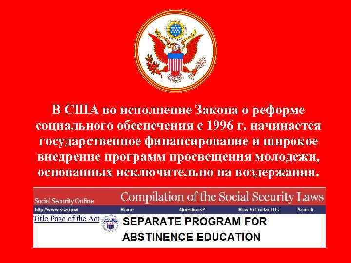 В США во исполнение Закона о реформе социального обеспечения с 1996 г. начинается государственное финансирование и широкое внедрение программ просвещения молодежи, основанных исключительно на воздержании.