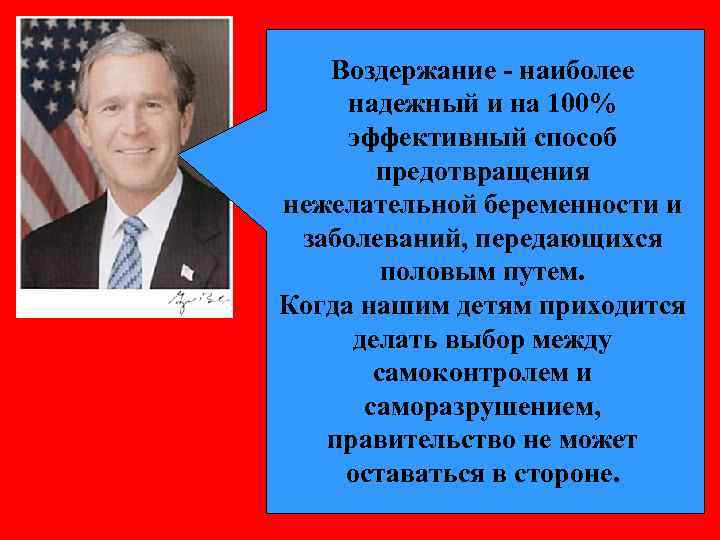 Воздержание - наиболее надежный и на 100% эффективный способ предотвращения нежелательной беременности и заболеваний, передающихся половым путем. Когда нашим детям приходится делать выбор между самоконтролем и саморазрушением, правительство не может оставаться в стороне.