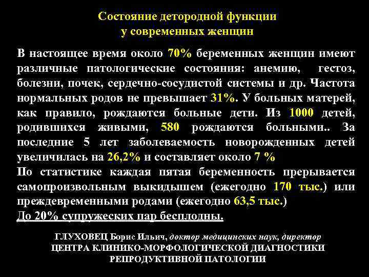 Состояние детородной функции у современных женщин В настоящее время около 70% беременных женщин имеют различные патологические состояния: анемию, гестоз, болезни, почек, сердечно-сосудистой системы и др. Частота нормальных родов не превышает 31%. У больных матерей, как правило, рождаются больные дети. Из 1000 детей, родившихся живыми, 580 рождаются больными. . За последние 5 лет заболеваемость новорожденных детей увеличилась на 26, 2% и составляет около 7 % По статистике каждая пятая беременность прерывается самопроизвольным выкидышем (ежегодно 170 тыс. ) или преждевременными родами (ежегодно 63, 5 тыс. ) До 20% супружеских пар бесплодны. ГЛУХОВЕЦ Борис Ильич, доктор медицинских наук, директор ЦЕНТРА КЛИНИКО-МОРФОЛОГИЧЕСКОЙ ДИАГНОСТИКИ РЕПРОДУКТИВНОЙ ПАТОЛОГИИ