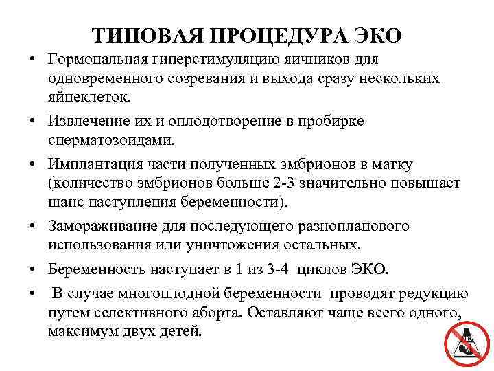 ТИПОВАЯ ПРОЦЕДУРА ЭКО • Гормональная гиперстимуляцию яичников для одновременного созревания и выхода сразу нескольких яйцеклеток. • Извлечение их и оплодотворение в пробирке сперматозоидами. • Имплантация части полученных эмбрионов в матку (количество эмбрионов больше 2 -3 значительно повышает шанс наступления беременности). • Замораживание для последующего разнопланового использования или уничтожения остальных. • Беременность наступает в 1 из 3 -4 циклов ЭКО. • В случае многоплодной беременности проводят редукцию путем селективного аборта. Оставляют чаще всего одного, максимум двух детей.