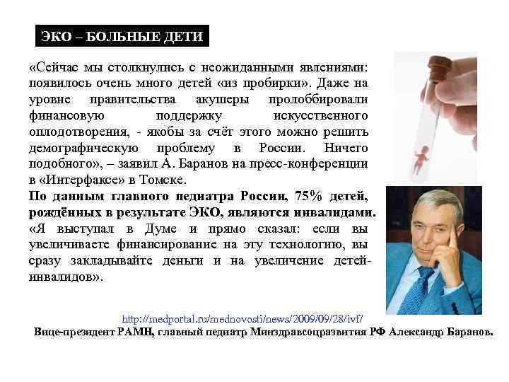 ЭКО – БОЛЬНЫЕ ДЕТИ «Сейчас мы столкнулись с неожиданными явлениями: появилось очень много детей «из пробирки» . Даже на уровне правительства акушеры пролоббировали финансовую поддержку искусственного оплодотворения, - якобы за счёт этого можно решить демографическую проблему в России. Ничего подобного» , – заявил А. Баранов на пресс-конференции в «Интерфаксе» в Томске. По данным главного педиатра России, 75% детей, рождённых в результате ЭКО, являются инвалидами. «Я выступал в Думе и прямо сказал: если вы увеличиваете финансирование на эту технологию, вы сразу закладывайте деньги и на увеличение детейинвалидов» . http: //medportal. ru/mednovosti/news/2009/09/28/ivf/ Вице-президент РАМН, главный педиатр Минздравсоцразвития РФ Александр Баранов.