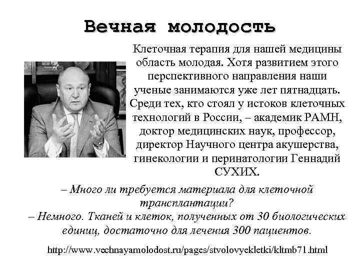 Вечная молодость Клеточная терапия для нашей медицины область молодая. Хотя развитием этого перспективного направления наши ученые занимаются уже лет пятнадцать. Среди тех, кто стоял у истоков клеточных технологий в России, – академик РАМН, доктор медицинских наук, профессор, директор Научного центра акушерства, гинекологии и перинатологии Геннадий СУХИХ. – Много ли требуется материала для клеточной трансплантации? – Немного. Тканей и клеток, полученных от 30 биологических единиц, достаточно для лечения 300 пациентов. http: //www. vechnayamolodost. ru/pages/stvolovyekletki/kltmb 71. html