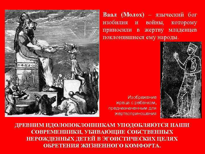 Ваал (Молох) – языческий бог изобилия и войны, которому приносили в жертву младенцев поклонявшиеся ему народы. Изображение жреца с ребенком, предназначенным для жертвоприношения ДРЕВНИМ ИДОЛОПОКЛОННИКАМ УПОДОБЛЯЮТСЯ НАШИ СОВРЕМЕННИКИ, УБИВАЮЩИЕ СОБСТВЕННЫХ НЕРОЖДЕННЫХ ДЕТЕЙ В ЭГОИСТИЧЕСКИХ ЦЕЛЯХ ОБРЕТЕНИЯ ЖИЗНЕННОГО КОМФОРТА.