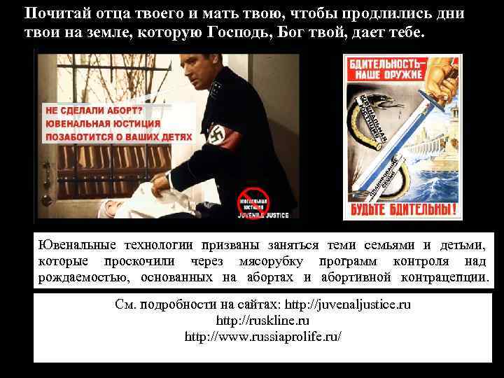 Почитай отца твоего и мать твою, чтобы продлились дни твои на земле, которую Господь, Бог твой, дает тебе. Ювенальные технологии призваны заняться теми семьями и детьми, которые проскочили через мясорубку программ контроля над рождаемостью, основанных на абортах и абортивной контрацепции. См. подробности на сайтах: http: //juvenaljustice. ru http: //ruskline. ru http: //www. russiaprolife. ru/