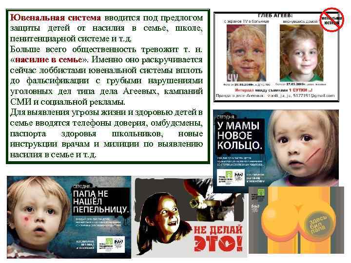 Ювенальная система вводится под предлогом защиты детей от насилия в семье, школе, пенитенциарной системе и т. д. Больше всего общественность тревожит т. н. «насилие в семье» . Именно оно раскручивается сейчас лоббистами ювенальной системы вплоть до фальсификации с грубыми нарушениями уголовных дел типа дела Агеевых, кампаний СМИ и социальной рекламы. Для выявления угрозы жизни и здоровью детей в семье вводятся телефоны доверия, омбудсмены, паспорта здоровья школьников, новые инструкции врачам и милиции по выявлению насилия в семье и т. д.