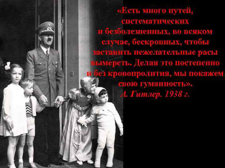 «Есть много путей, систематических и безболезненных, во всяком случае, бескровных, чтобы заставить нежелательные расы вымереть. Делая это постепенно и без кровопролития, мы покажем свою гуманность» . А. Гитлер. 1938 г.