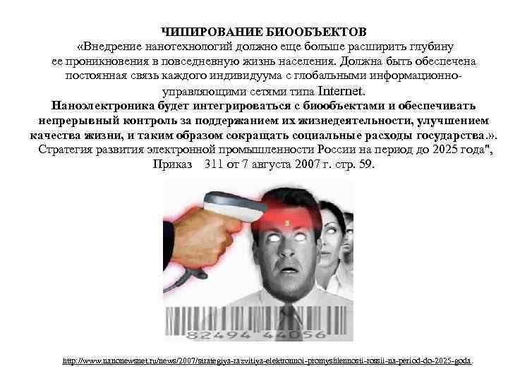 ЧИПИРОВАНИЕ БИООБЪЕКТОВ «Внедрение нанотехнологий должно еще больше расширить глубину ее проникновения в повседневную жизнь населения. Должна быть обеспечена постоянная связь каждого индивидуума с глобальными информационноуправляющими сетями типа Internet. Наноэлектроника будет интегрироваться с биообъектами и обеспечивать непрерывный контроль за поддержанием их жизнедеятельности, улучшением качества жизни, и таким образом сокращать социальные расходы государства. » . Стратегия развития электронной промышленности России на период до 2025 года", Приказ 311 от 7 августа 2007 г. стр. 59. http: //www. nanonewsnet. ru/news/2007/strategiya-razvitiya-elektronnoi-promyshlennosti-rossii-na-period-do-2025 -goda.
